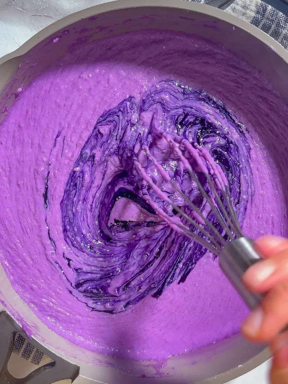 Après avoir battu votre lait et votre poudre ; Versez votre préparation de Ube sur votre lait.